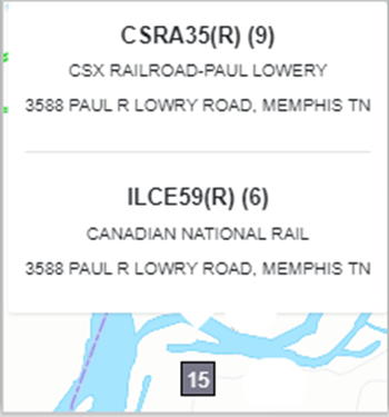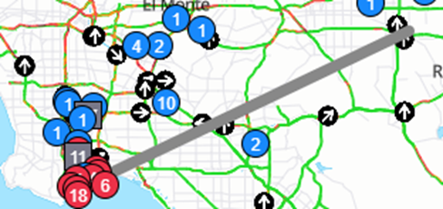 NOTE: Hover over any blue or red circle or gray square to display the customer location code, name & address. The number inside the circle or square indicates the number of moves available at that location. Left click on any location and the moves indicated with display under the Move section of the DO.