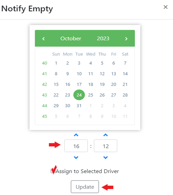 Left click on the applicable calendar date and update/change the time to match the time/date that the container # was reported to be empty. Next, left click on the “Update” button to record the change on the equipment move “card”. (As above)