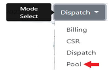 “Pool” mode can be used to manage the equipment pools within a defined area. To access “Pool” mode, left click on the “Dispatch” dropdown arrow then left click on “Pool”. (As below) Mode