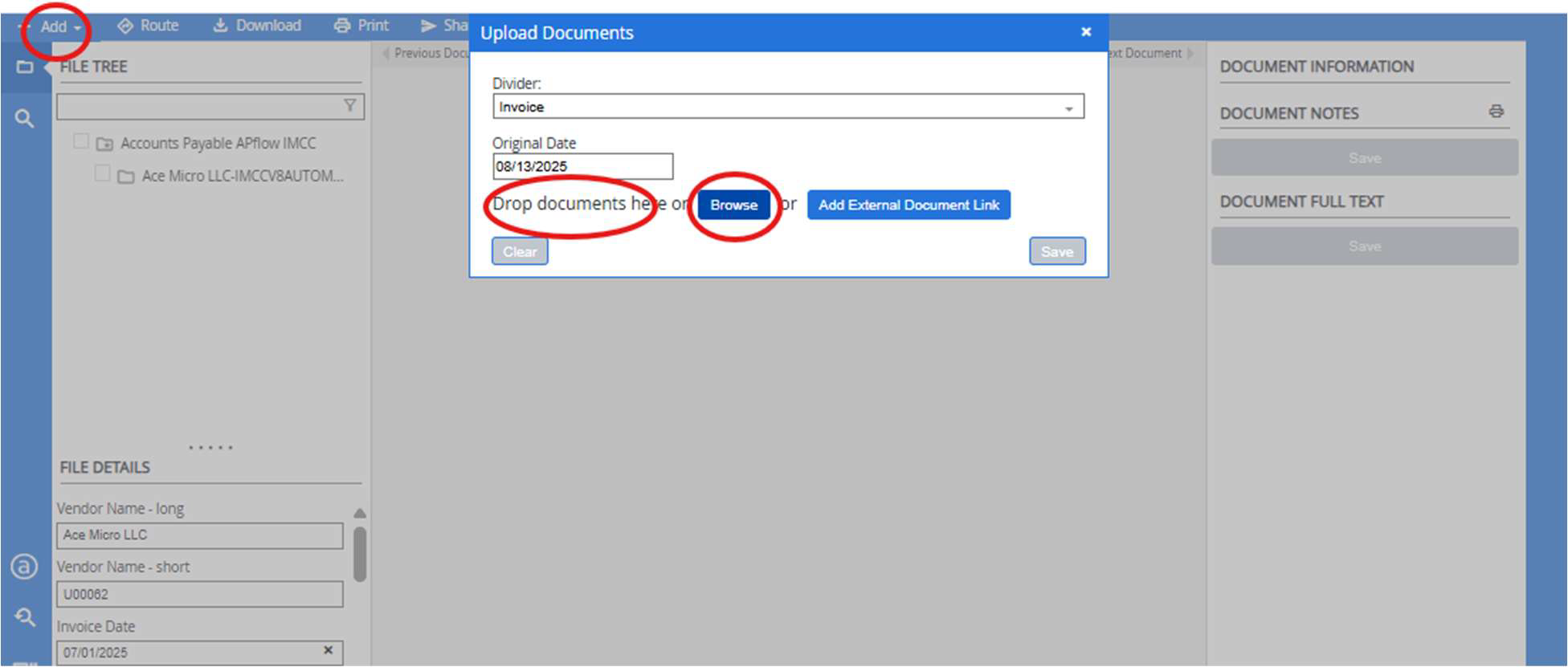 Navigate to the target Invoice and open the Web Viewer, choose Upload