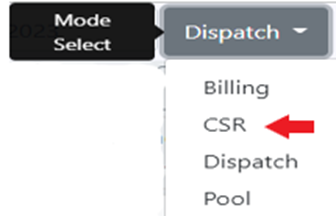 “CSR” mode can be used to display both the assigned & unassigned order pros for a specific CSR. A CSR could use this mode to check on driver’s eta’s to the customer and/or what order pros have not been assigned yet, among other uses. To access “CSR” mode, left click on the “Dispatch” dropdown arrow then left click on “CSR”. (As below)