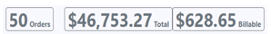 Based on applied filter settings, the total # of orders in that query/filter will be displayed at the top of the worksheet, along with the Total (Sales) amount and the Billable amount. The Total $ amount indicates the total outstanding sales. The Billable amount is the $ amount that can be billed to the customers at that time.
