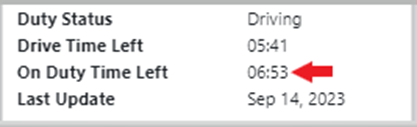 Left click on a Driver’s “card” to select then left click on the “card” to expand or left click on the ”+” sign (Toggle Detail Info) directly above the Driver’s “card” to expand. On Duty Time Left is displayed as below.