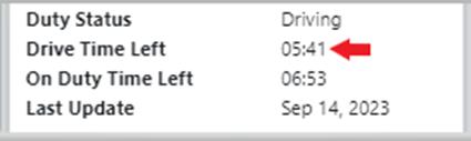 Left click on a Driver’s “card” to select then left click on the “card” to expand or left click on the ”+” sign (Toggle Detail Info) directly above the Driver’s “card” to expand. Drive Time Left is displayed as below.