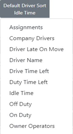 “Default Driver Sort Assignments”- Left click on this action button to display a list of possible default Driver Sort options. Left click on the desired Sort to select that filter. (As below) Next, left click outside the filter window to close said window.