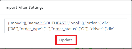 To IMPORT a filter that has been exported to you, first open the email that was sent and copy ALL of the text in the body of the email. Next, left click on the Import button and paste ALL of the copied data from the email into the field. Next, left click on the “Update” button. (As below)