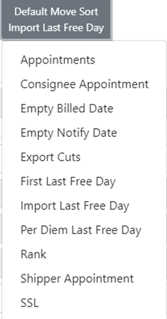 ”Default Move Sort Rank”- Left click on this action button to display a list of possible default Sort options for the available (Equipment) Moves or (Dispatch) Moves. Left click on the desired Sort to select that filter. (As below) Next, left click outside the filter window to close said window.