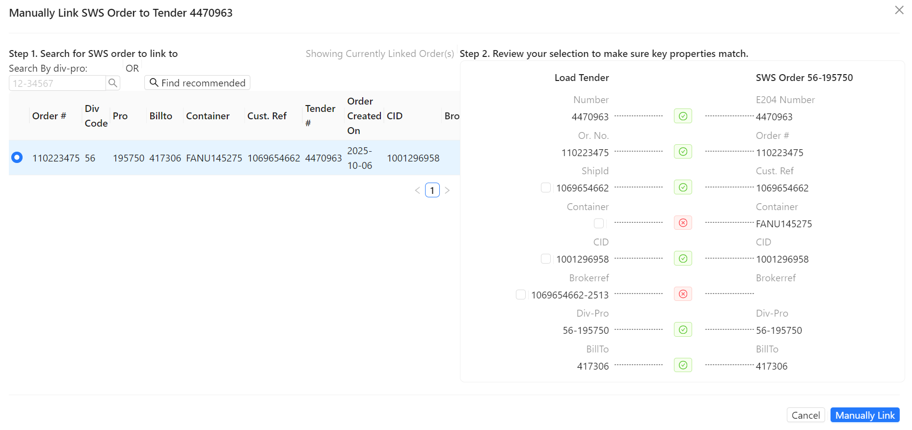 An example of the Linking Screen is below. Note that the “Brokerref” (which is the Tracking ID) can be found on the Load Tender but is not found in the SWS Order itself.