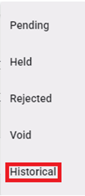 “Historical” status will display those documents that have been approved by Revenue Accounting in the DocAudit Portal. To view a particular Pro in “Historical” status, left click on the line to open the document viewing and (if applicable) action window.