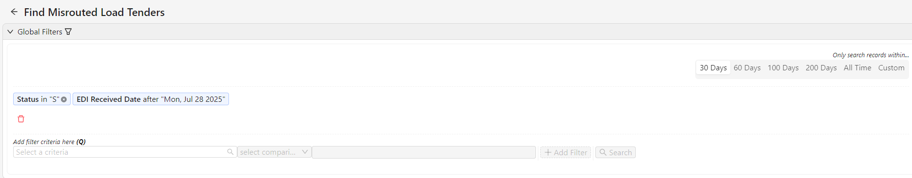 NOTE: If no result is found when filtering by one of the filter criteria, double check that the entered data is correct. If correct as entered, no EDI Load Tender has been received at that current time. Reach out to the customer and request the “missing” tenders be resent.
