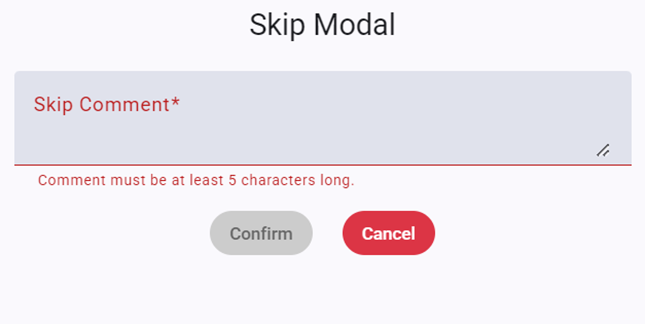 The below “Skip Modal” window will popup. A “Skip Comment” is required. Type the comment in the field (minimum of 5 characters) then left click on the “Confirm” button. The “Confirm” button will be active (and turn green) once the minimum characters are entered. To abort the process, left click on the red “Cancel” button. (As below)