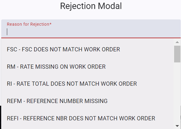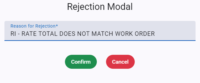 Start typing the reason for rejection in the “Reason for Rejection*” field to find the desired code or use the dropdown to locate and select. Once a Reason has been selected, left click on the “Confirm” button. Otherwise, left click on the “Cancel” button to return to the previous screen. (As below)