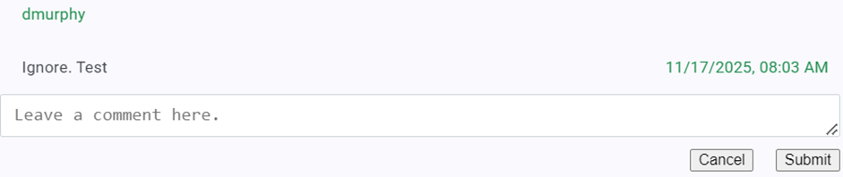 Additional comments can be entered in the “Leave a comment here” field above, then left click the “Submit” button. Comments are not required. (Example below)