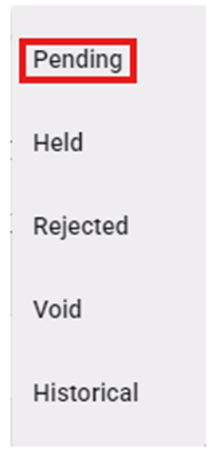 If you have Revenue Accounting Approver Permissions, upon launch of the portal, “Pending” is the default status. The current status will display at the top center of the page. (As below)