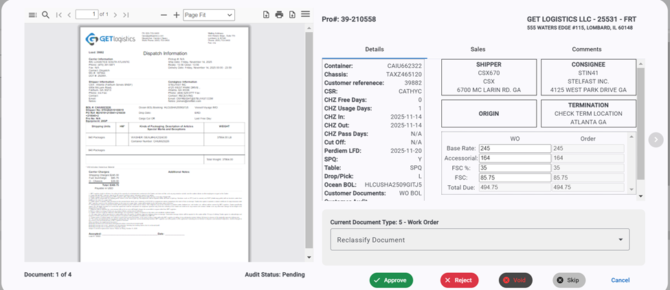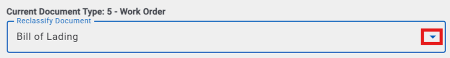 If you notice that a document has just been classified incorrectly, you can use the “Reclassify Document” dropdown arrow to select the correct classification, then left click on the “Approve” button located at the bottom of the screen. In the example below, the document being audited was classified as a “Work Order” but the document was determined to be a “Bill of Lading”.