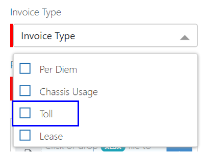 For non-DCLI Toll Invoices, select Toll from the Invoice Type drop down menu. (As below)