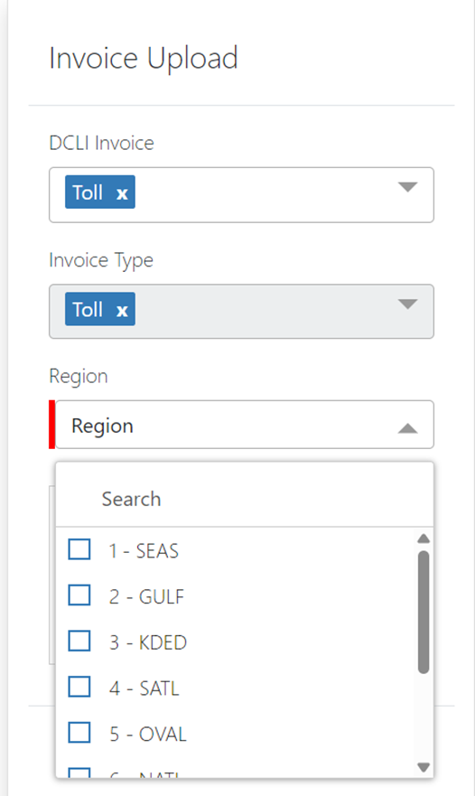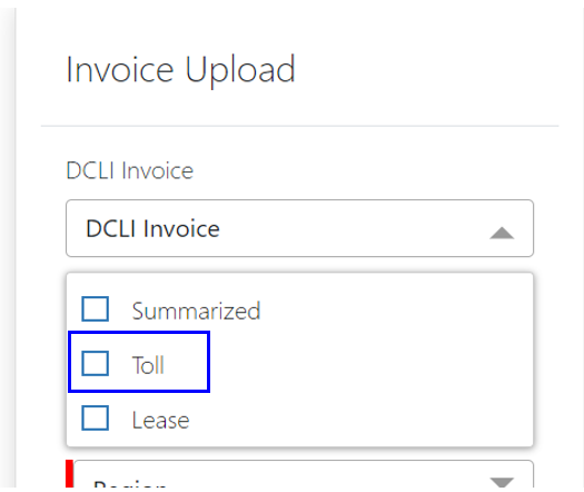 Once on the Invoice Upload screen, select Toll from the DCLI Invoice drop down menu. (As below)