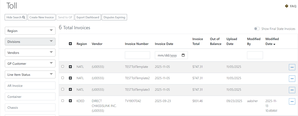 Processing of Toll invoices has the same flow as Per Diem and Chassis with the same or similar invoice statuses as Chassis.