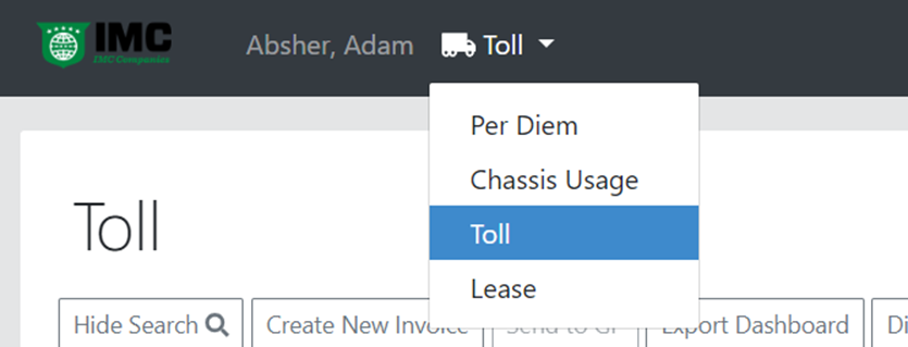 Selecting Toll will take you to a dashboard screen that is similar to the Per Diem and Chassis dashboard. (As below)