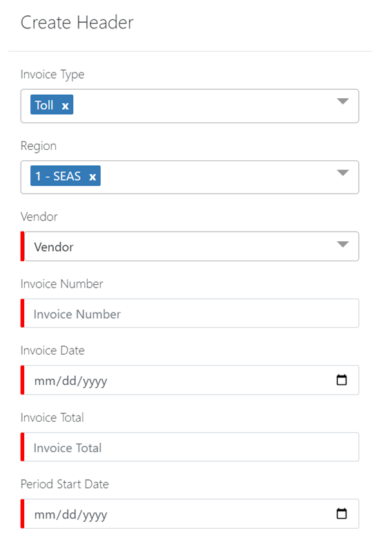 Next, the Create Header screen will display. (As below) Select the Vendor, enter the Invoice Number, Invoice Date, Invoice Total, Period Start Date and Period End Date. Lastly, click Add.