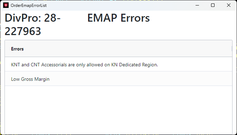 When you remove the Invoice Hold flag on an order, the order will go through a validation process. If the Pro falls outside the established invoicing rules, the Exception Management Audit Portal (EMAP) will display the error message below and will not allow the Invoice Hold flag to be removed.