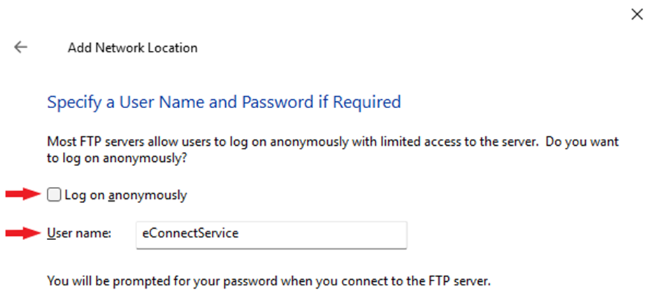 Step 6: Uncheck the “Log on anonymously” box and then type eConnectService in the “User name” field. (As below)