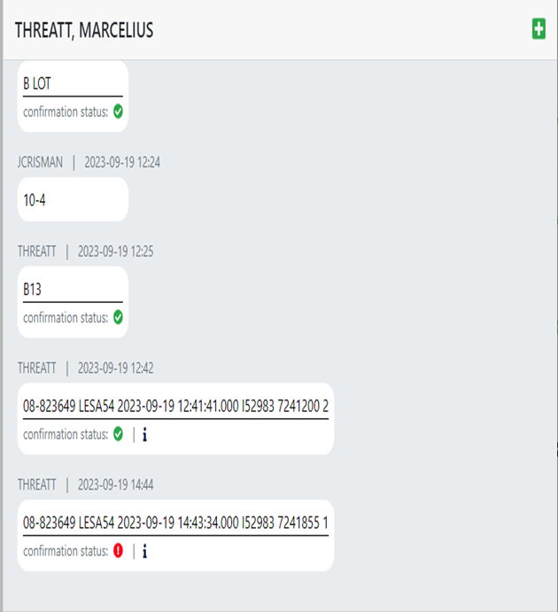 To Read & Confirm a driver’s message, left click on the bubble itself. The RED explanation point indicates an “Unconfirmed” message. Left click on this symbol to confirm the message. (As below)