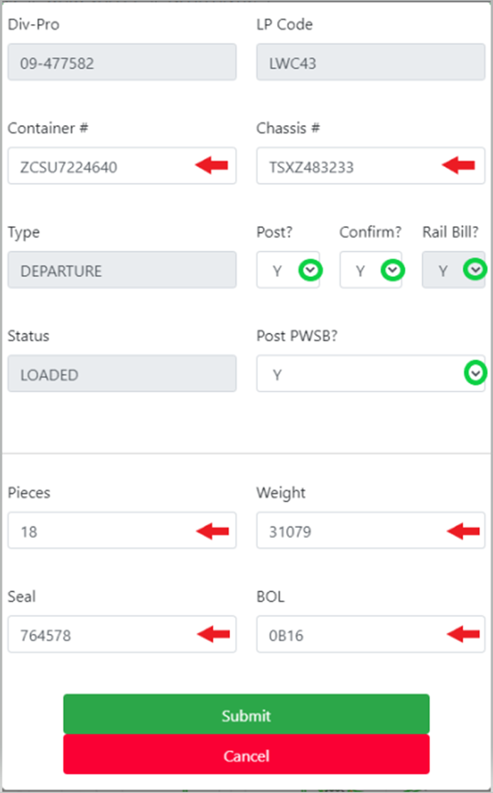 If necessary, five (5) fields can be edited within this window: Container #, Chassis #, Pieces, Weight, Seal and BOL. (As indicated by red arrows above)